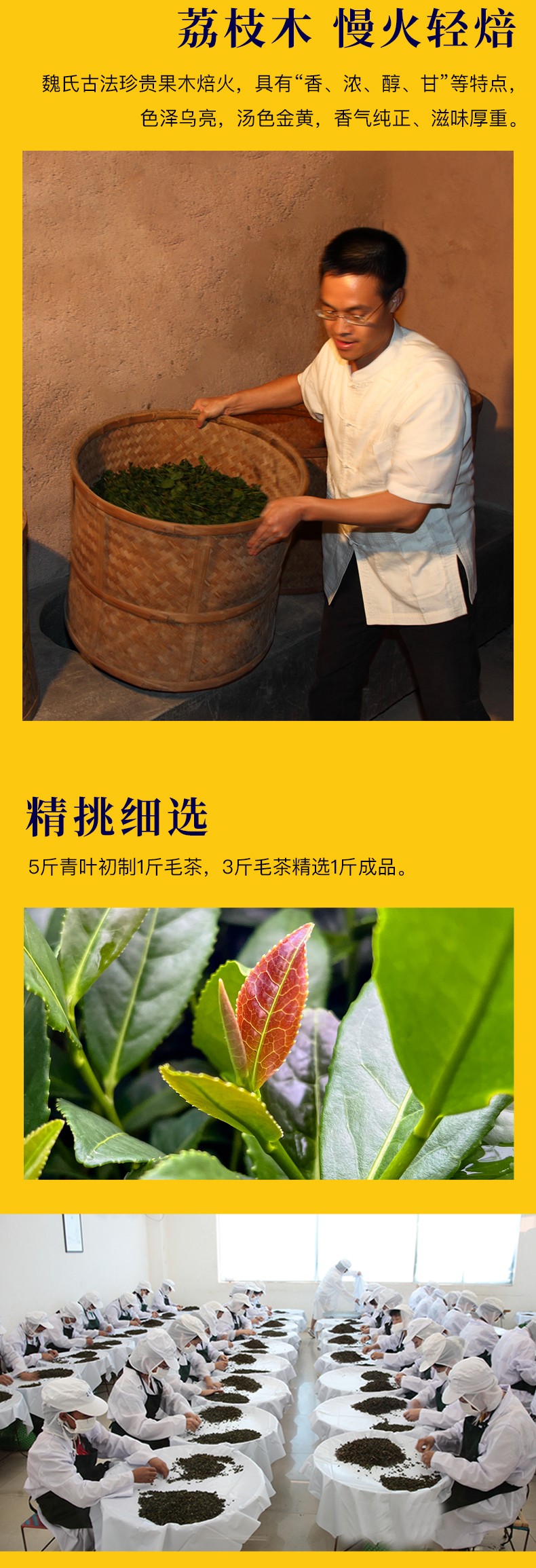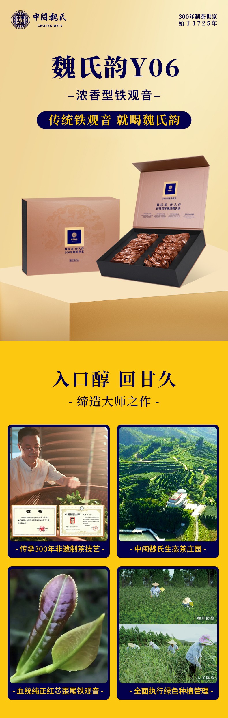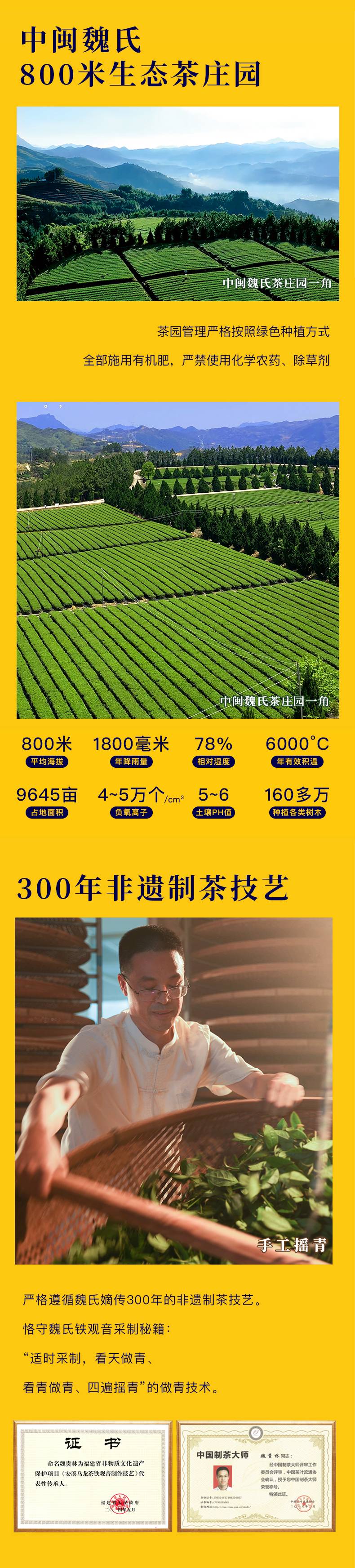 中闽魏氏是铁观音300年制茶世家,严循魏氏嫡传采制技艺,恪守祖训。魏氏韵系列是安溪浓香铁观音的代表,是天、地、人、种完美结合之精华,传统果木烘焙,檀香馥郁,润肠暖胃,滋养身心,醇厚甘爽。