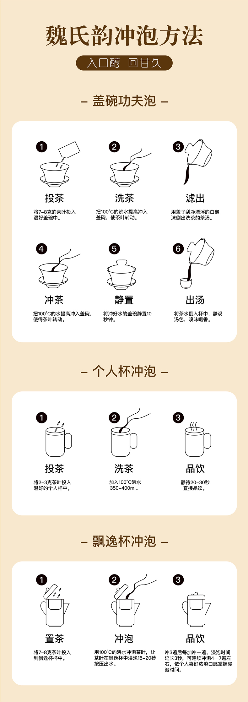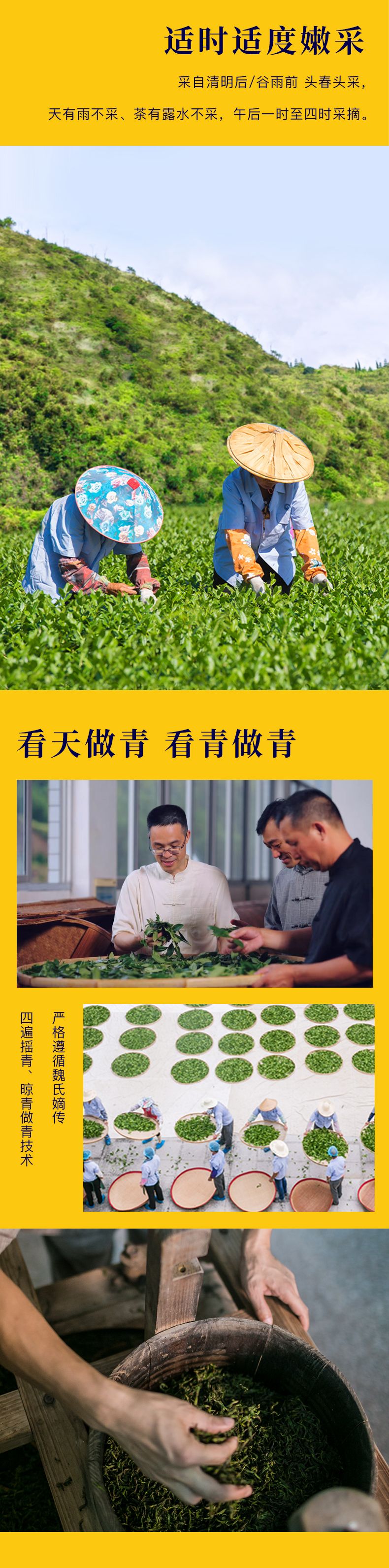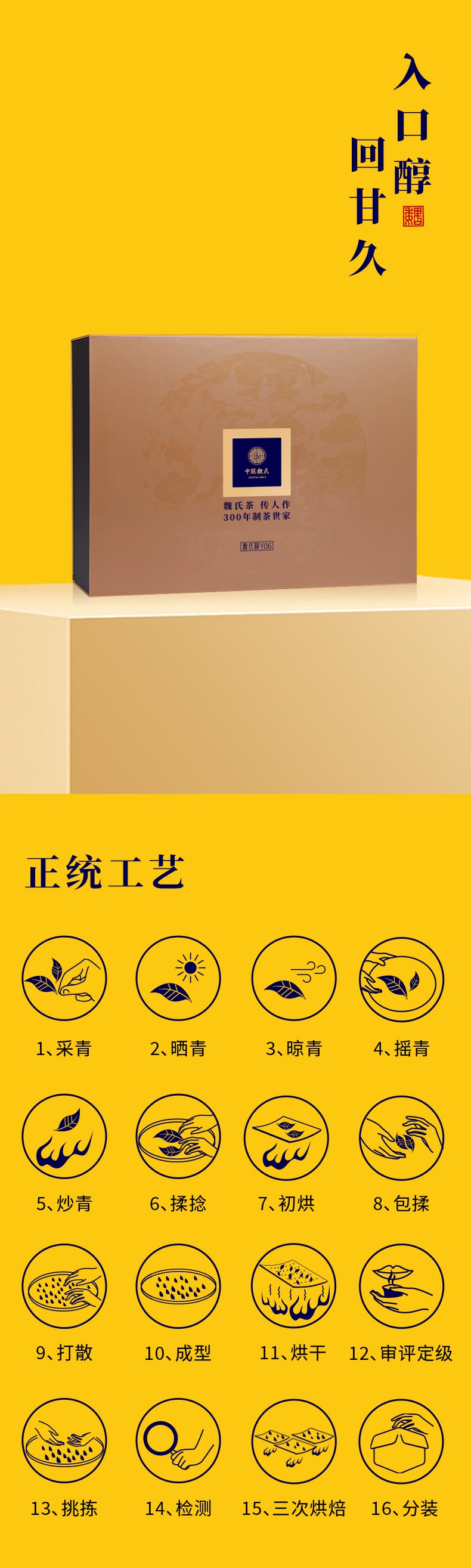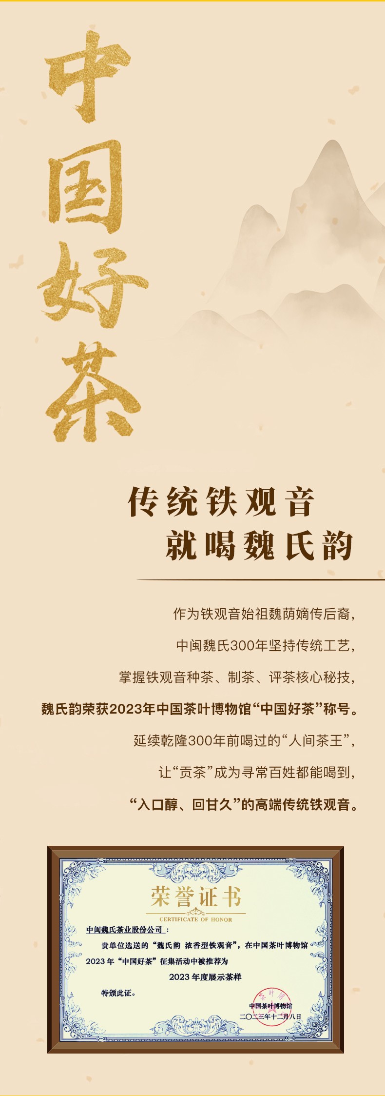 中闽魏氏是铁观音300年制茶世家,严循魏氏嫡传采制技艺,恪守祖训。魏氏韵系列是安溪浓香铁观音的代表,是天、地、人、种完美结合之精华,传统果木烘焙,檀香馥郁,润肠暖胃,滋养身心,醇厚甘爽。