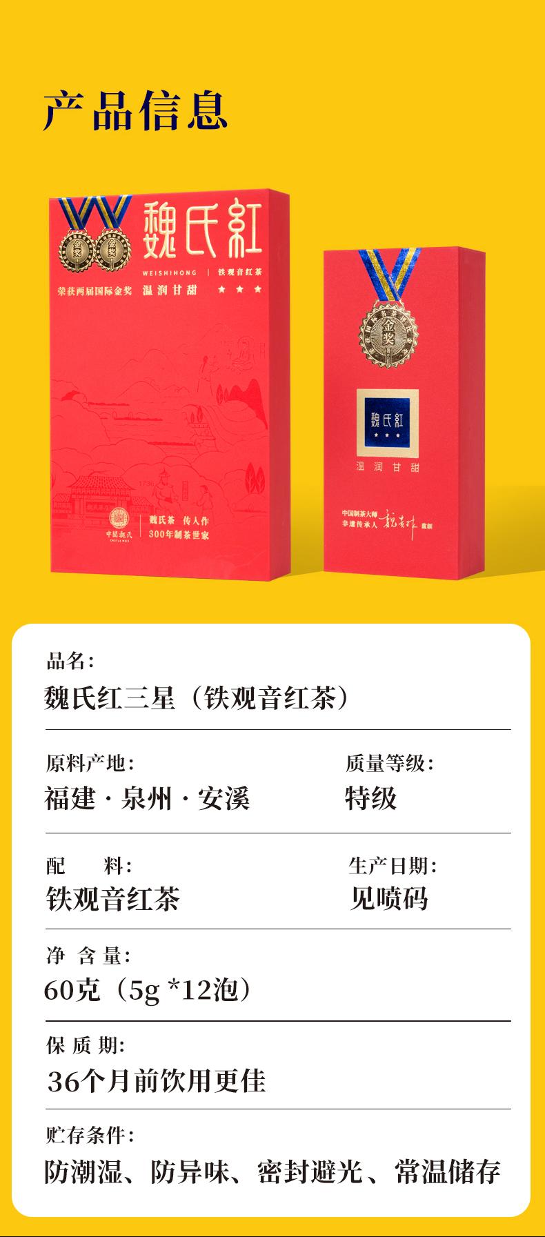 中闽魏氏是铁观音300年制茶世家,严循魏氏嫡传采制技艺,恪守祖训。魏氏红系列是中闽魏氏董事长魏贵林携团队历经3年1000多个日夜研发出来的铁观音红茶,将铁观音的摇青工艺和金骏眉的窝堆工艺结合精制而成,魏氏红拥有国家发明专利,解决了爱喝茶的又怕晚上睡不着的困扰,魏氏红,晚上喝,也好睡。