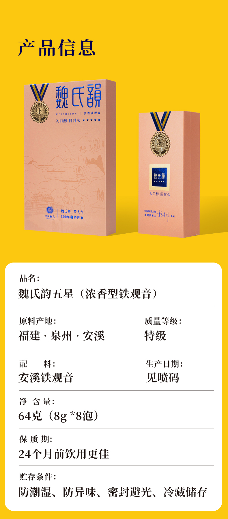 中闽魏氏是铁观音300年制茶世家,严循魏氏嫡传采制技艺,恪守祖训。魏氏韵系列是安溪浓香铁观音的代表,是天、地、人、种完美结合之精华,传统果木烘焙,檀香馥郁,润肠暖胃,滋养身心,醇厚甘爽。