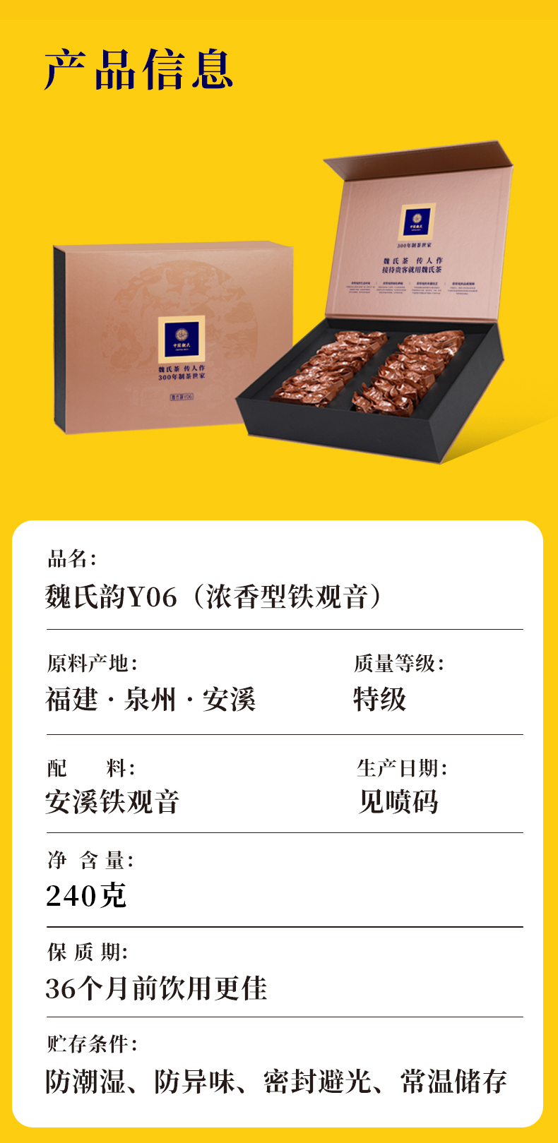 中闽魏氏是铁观音300年制茶世家,严循魏氏嫡传采制技艺,恪守祖训。魏氏韵系列是安溪浓香铁观音的代表,是天、地、人、种完美结合之精华,传统果木烘焙,檀香馥郁,润肠暖胃,滋养身心,醇厚甘爽。