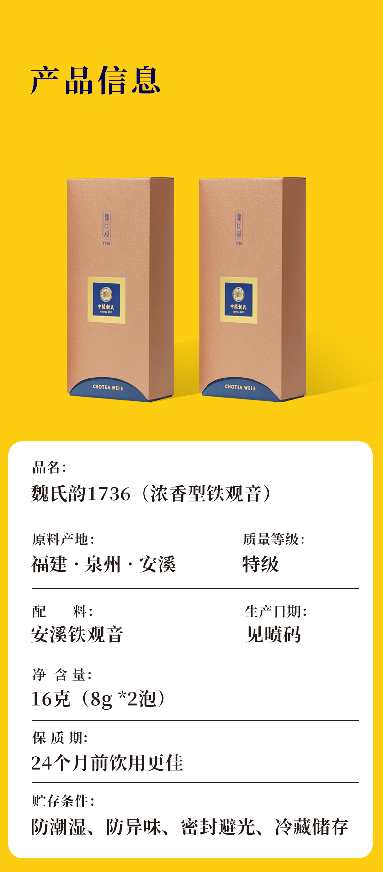 中闽魏氏是铁观音300年制茶世家,严循魏氏嫡传采制技艺,恪守祖训。魏氏韵系列是安溪浓香铁观音的代表,是天、地、人、种完美结合之精华,传统果木烘焙,檀香馥郁,润肠暖胃,滋养身心,醇厚甘爽。
